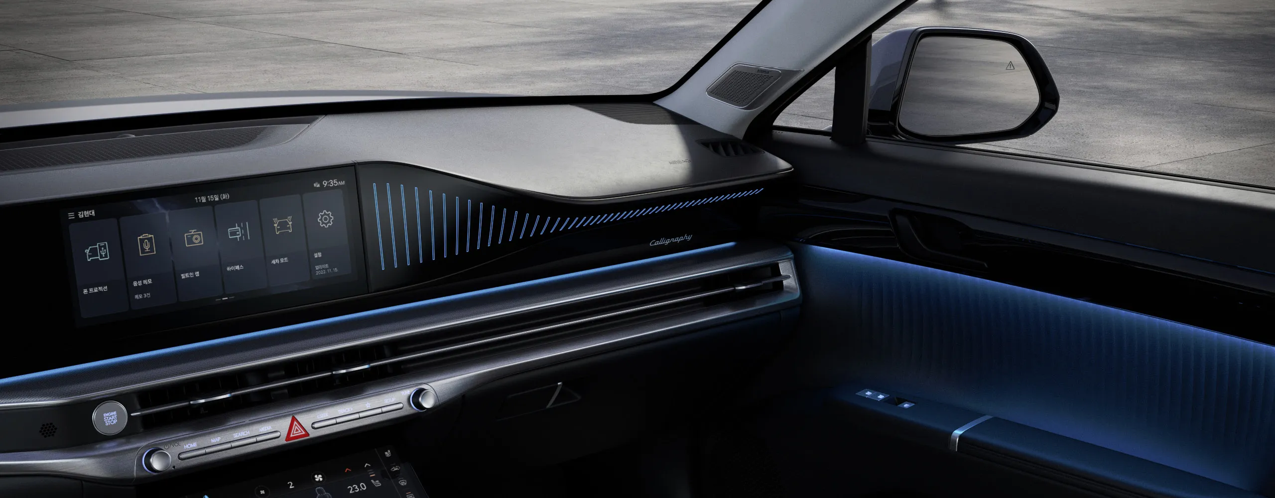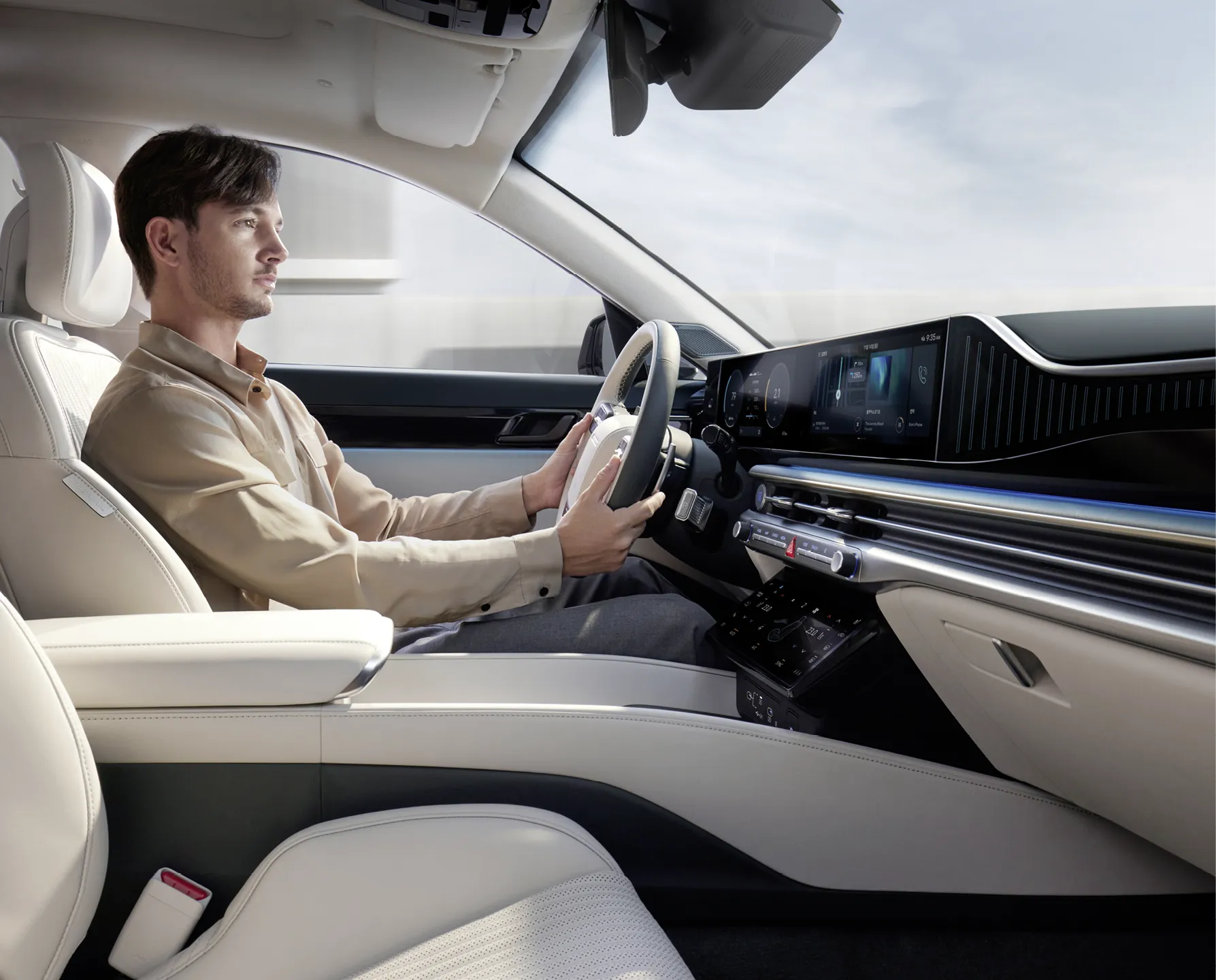 이 차량의 내부는 사용 편의성과 감성에 초점을 맞추어 디자인되었습니다. 인체공학 기반의 슬림화된 디자인으로 보다 넓고 안락한 느낌을 주며, 원 스포크 스타일 ‘D’컷 스티어링휠은 각 그랜저에서 영감을 받아 제작되었습니다.