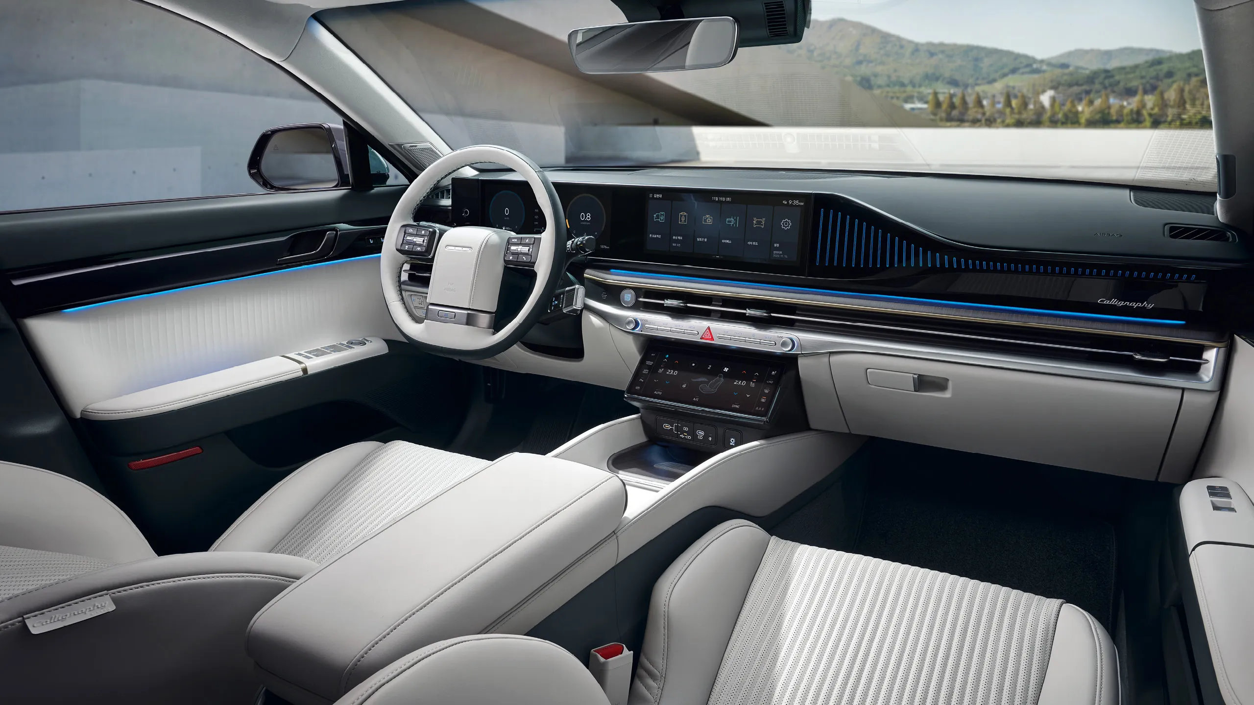 신형 그랜저 1.6 터보 하이브리드의 실내는 12.3인치 대화면 클러스터와 내비게이션, 10.25인치 대화면 통합 공조 컨트롤러 등 대형 디스플레이가 인상적입니다. 또한, 에르고 모션 시트와 앰비언트 라이트, 빌트인 캠 등 다양한 편의사양을 갖추고 있습니다.
