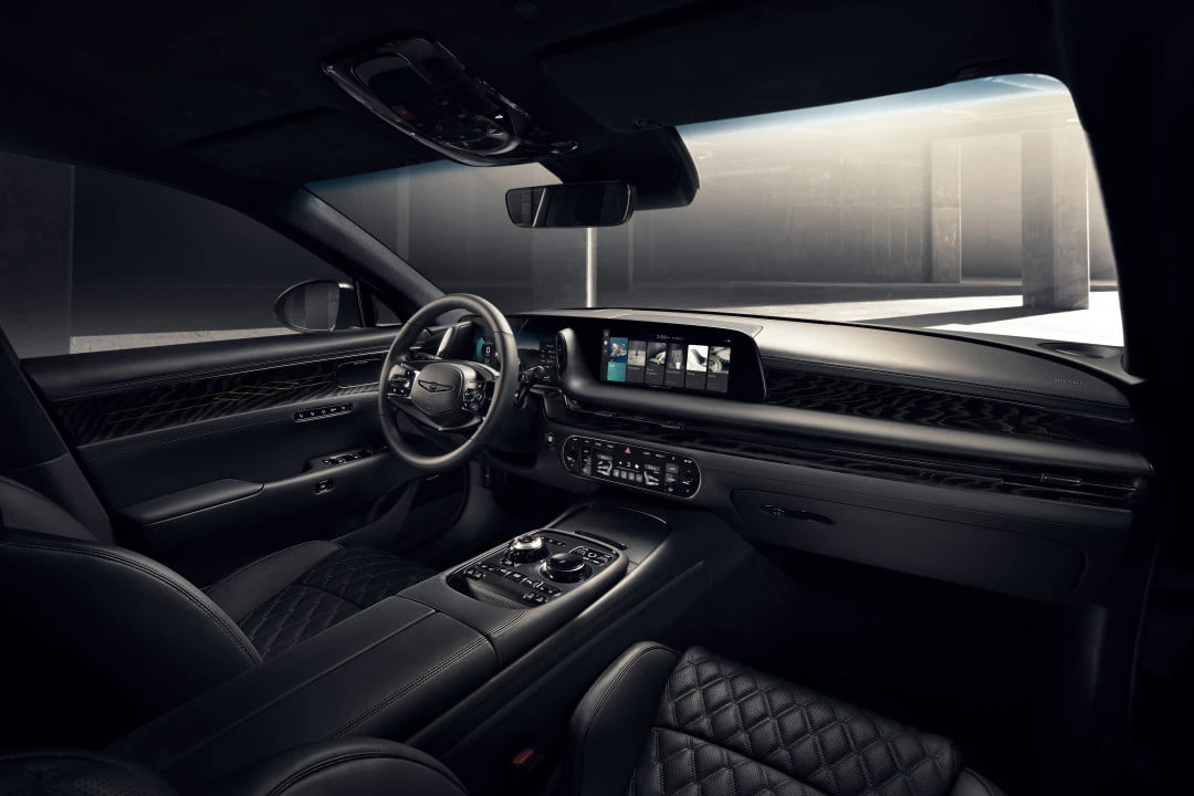G90 블랙은 실내를 작은 부분까지도 블랙 색상으로 일관되게 마감하여 차분하고 편안한 분위기를 조성합니다. 눈에 띄는 부분부터 눈에 띄지 않는 부분까지 블랙 색상으로 표현하며, 세련되고 고급스러운 분위기를 완성합니다. 주요 실내 특징은 다음과 같습니다.