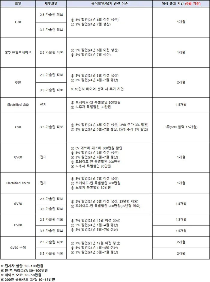 - 기타 모델: 최대 5% 할인 (G90 LWB는 추가 3% 할인)