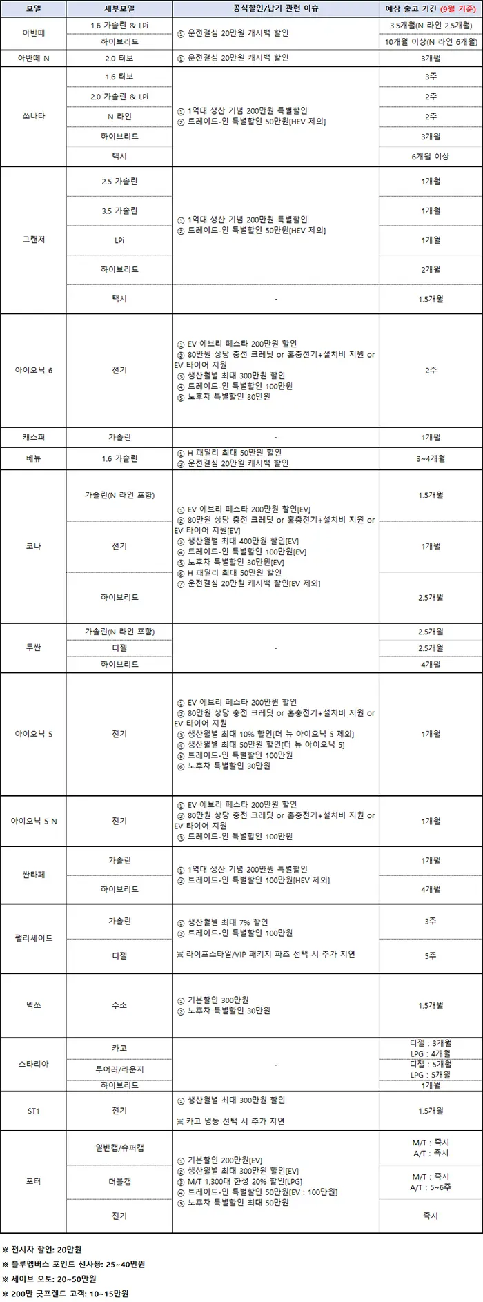 - 5년 이상 노후차 보유 고객: 30만원 추가 할인 (HEV 제외)