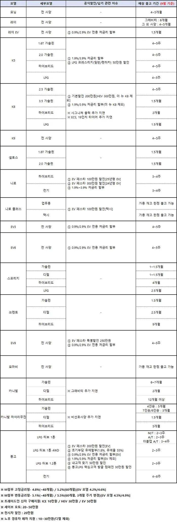 기아차도 빠질 수 없죠. 전 차종에 걸쳐 다양한 할부 프로그램과 할인 혜택을 제공합니다.