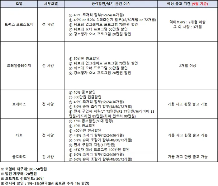 쉐보레에서도 풍성한 할인 혜택을 준비했습니다. 특히 대형 SUV 모델들의 할인폭이 눈에 띄네요!