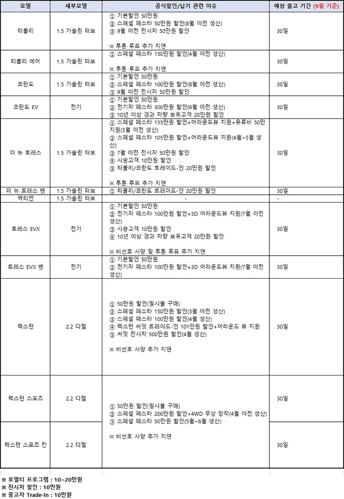 추가로, 티볼리나 토레스 구매 시 50만원 기본할인도 제공된다고 하네요. 렉스턴 시리즈를 일시불로 구매하면 50만원을 추가로 할인받을 수 있어요!