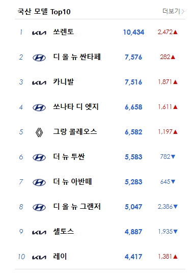 - 국산차 판매 순위: 쏘렌토 1만 대 돌파, 싼타페 맹추격!