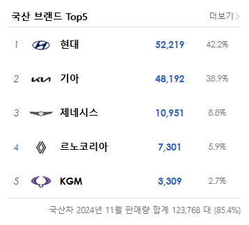 - 다나와 자동차: 2024년 11월 국산차 판매 순위 (https://auto.danawa.com/auto/?Work=record)