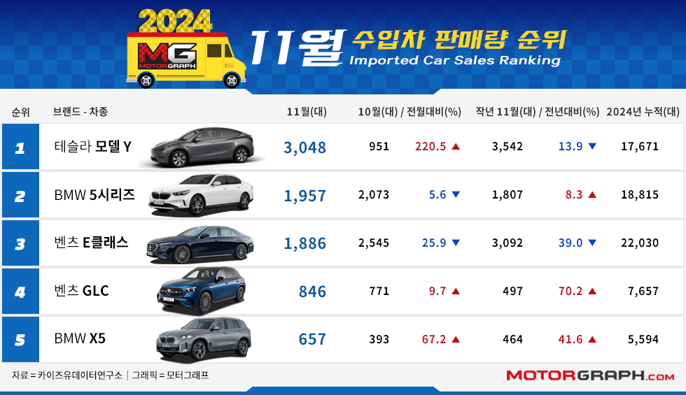 2024년 11월 수입차 판매량은 총 2만 3,784대로 전년 동월 대비 3.9% 감소했습니다. 테슬라 Model Y가 3,048대를 판매하며 1위를 차지했고, BMW 5시리즈가 1,957대로 2위, 벤츠 E클래스가 1,886대로 3위를 기록했습니다.
