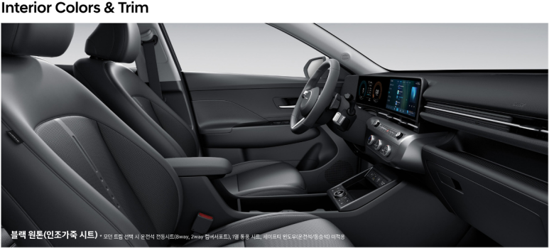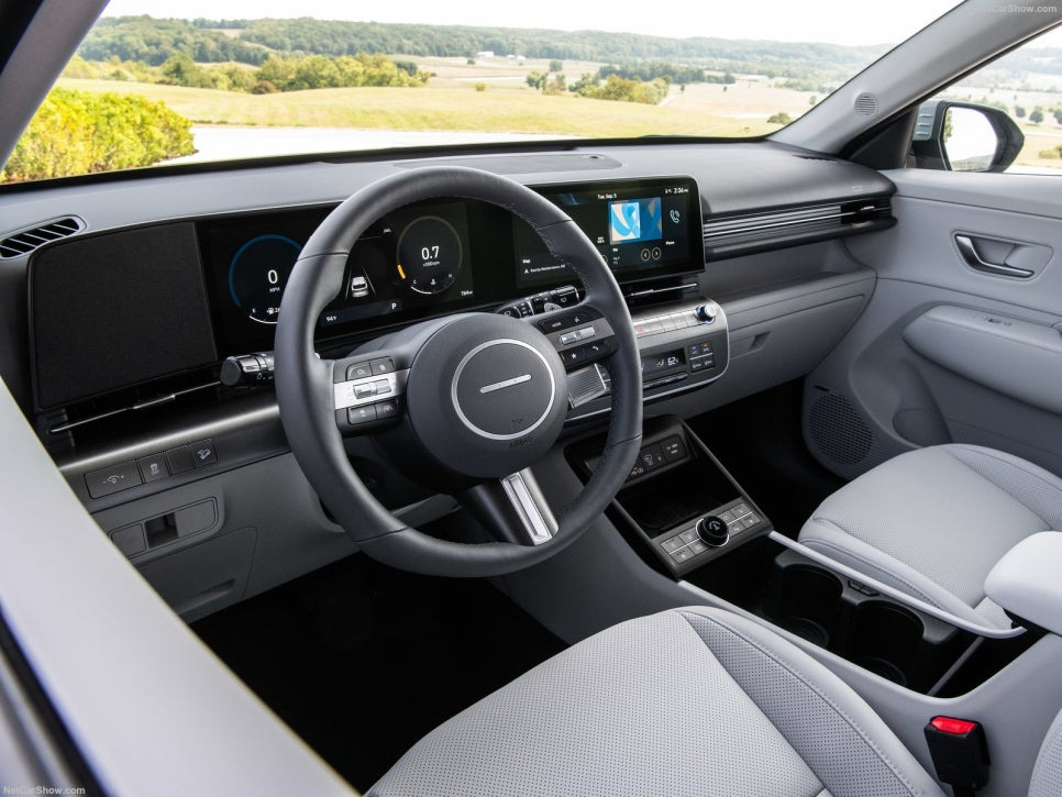 코나의 내부는 현대적인 감각으로 설계되어 있으며 편안함을 제공합니다. 운전석에는 디지털 계기판과 대형 터치스크린이 장착되어 있어 직관적인 조작이 가능합니다.