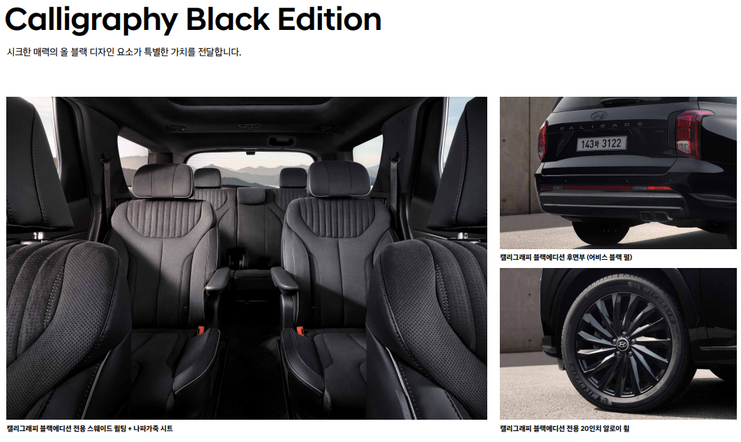 또한, 플래그십 SUV답게 팰리세이드 캘리그라피 블랙 에디션을 선보이면서 올 블랙의 시크한 매력을 한껏 더했습니다.