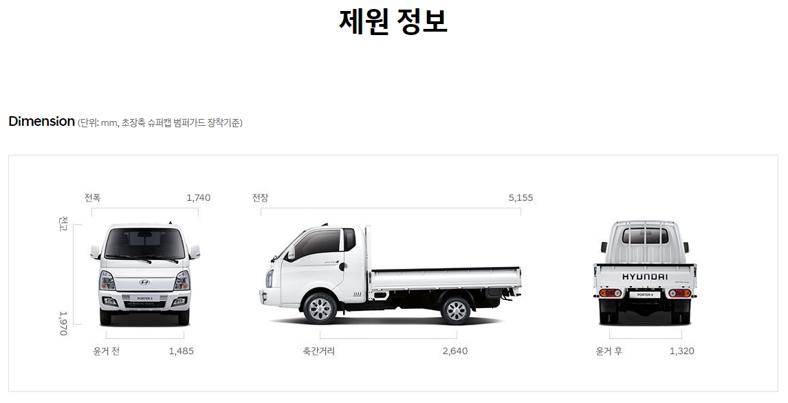 2024 포터2 LPG의 제원은 전폭 1,740, 전장 5,155, 전고 1,970입니다.