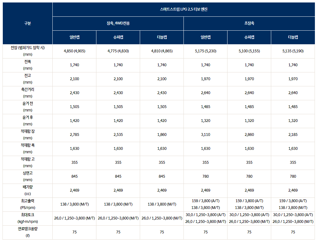 2024 포터2 LPG의 제원 (일반캡, 슈퍼캡, 더블캡)