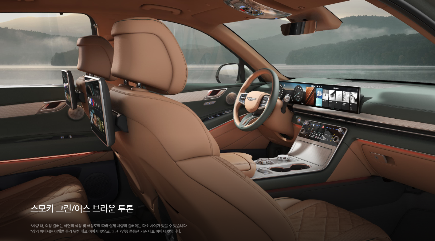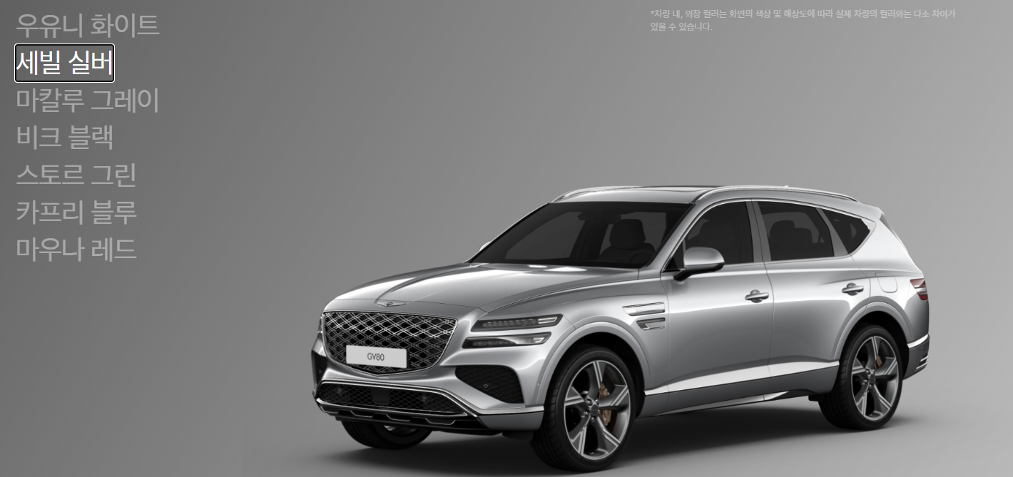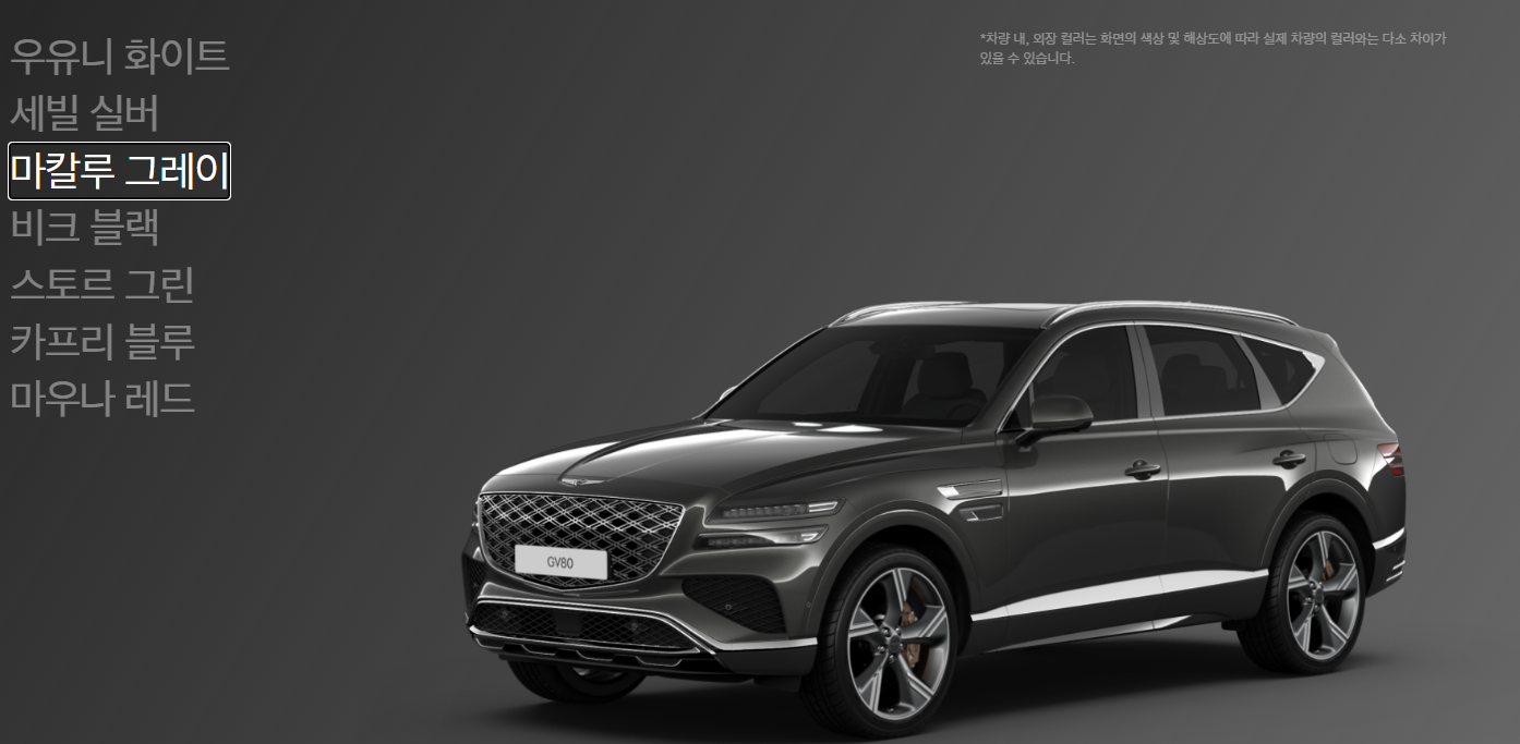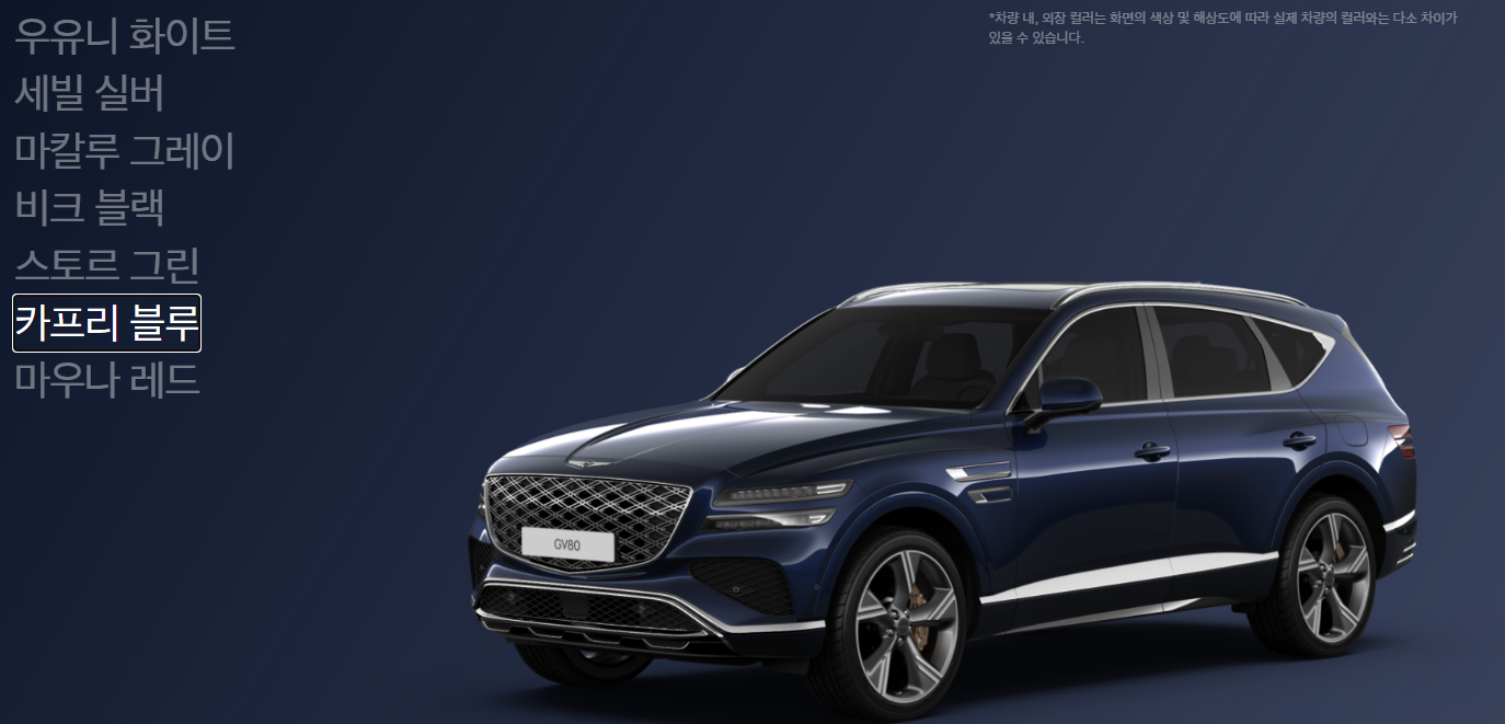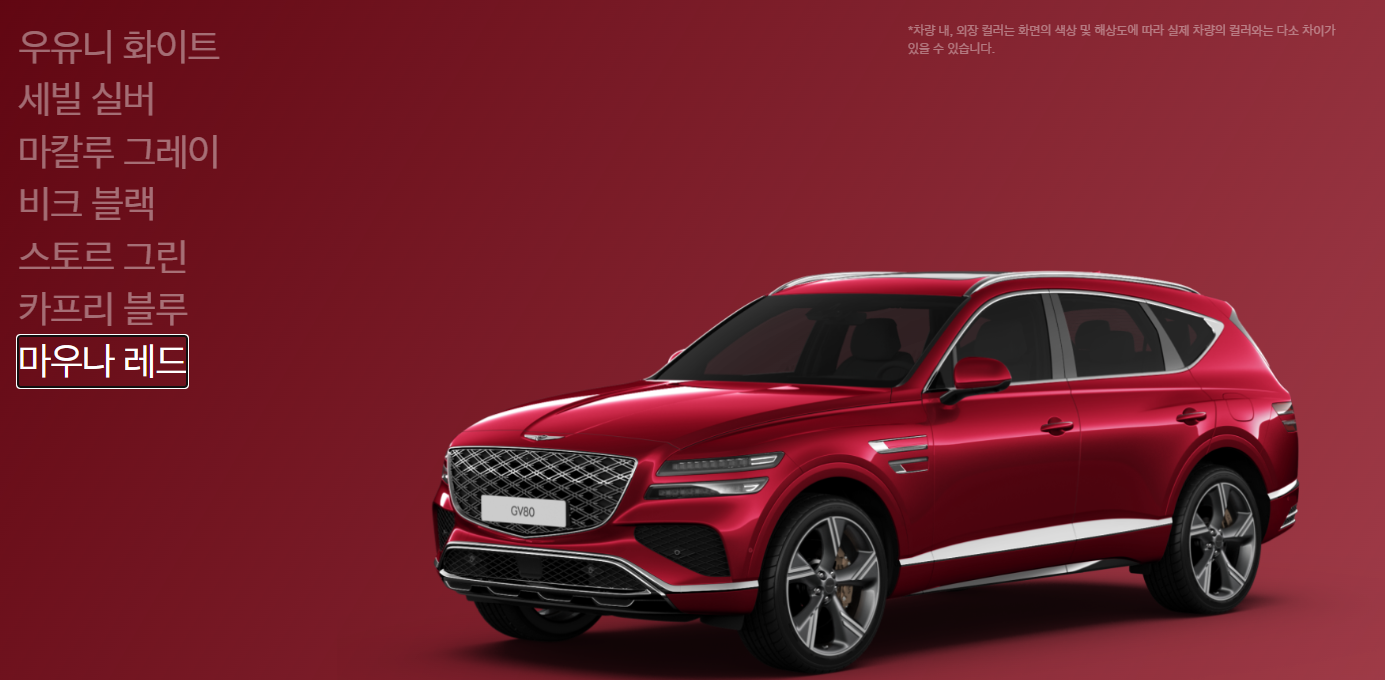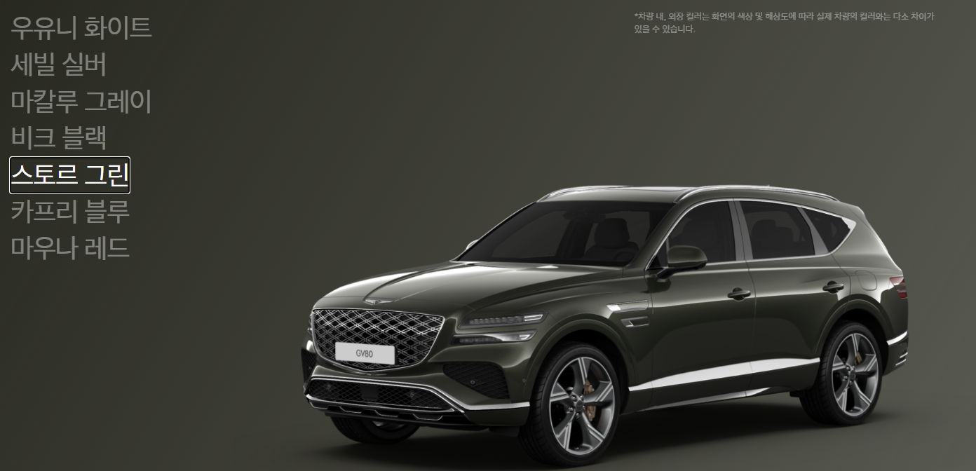 2024 GV80의 색상은 총 7가지로 우유니 화이트, 세빌 실버, 마칼루 그레이, 버크 블랙, 스토르 그린, 카프리 블루, 마우나 레드가 있습니다. 이번 2024 모델의 메인 컨셉 색상은 스토르 그린입니다.
