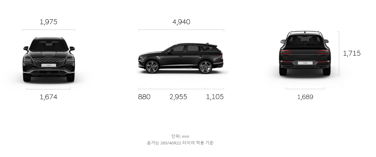 제네시스 GV80은 전장 4,940mm, 전고 1,715mm, 전폭 1,975mm, 축거 2,955mm이고, 배기량은 2,497~3,470cc입니다.