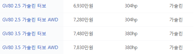 더 자세한 모델별 가격은 아래🔻 GV80 공식 가격표를