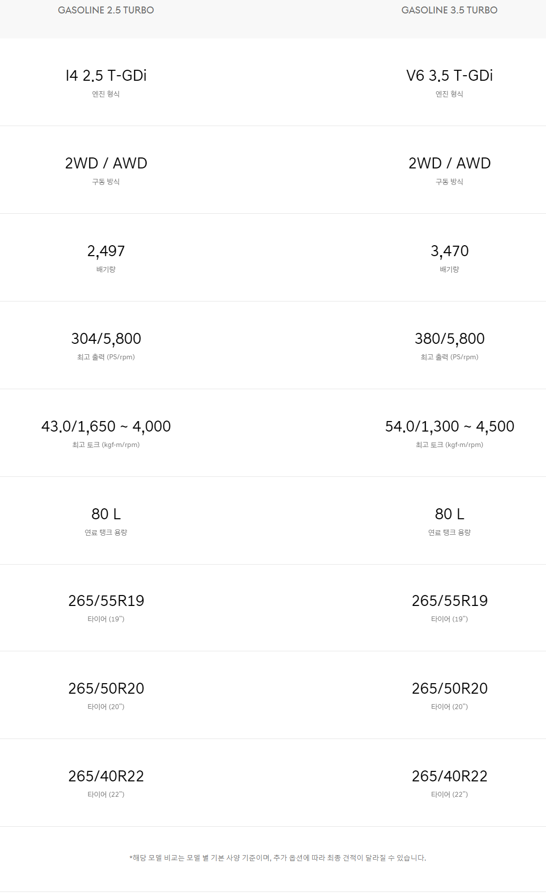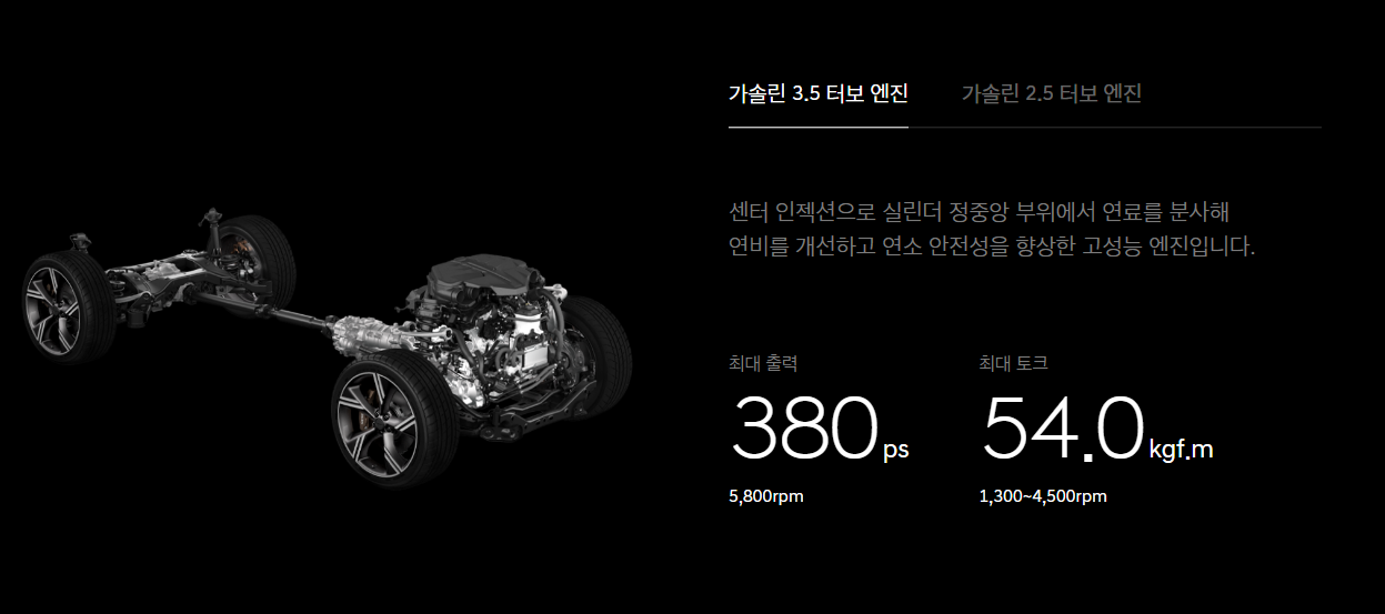 2024 GV80 모델은 2.5 가솔린 터보와 3.5 가솔린 터보 두 가지 파워트레인으로 출시되었습니다. 두 모델의 주행 성능 차이가 크기 때문에 본인의 주행 스타일과 주행 환경을 고려하여 상품성을 판단하시면 됩니다.
