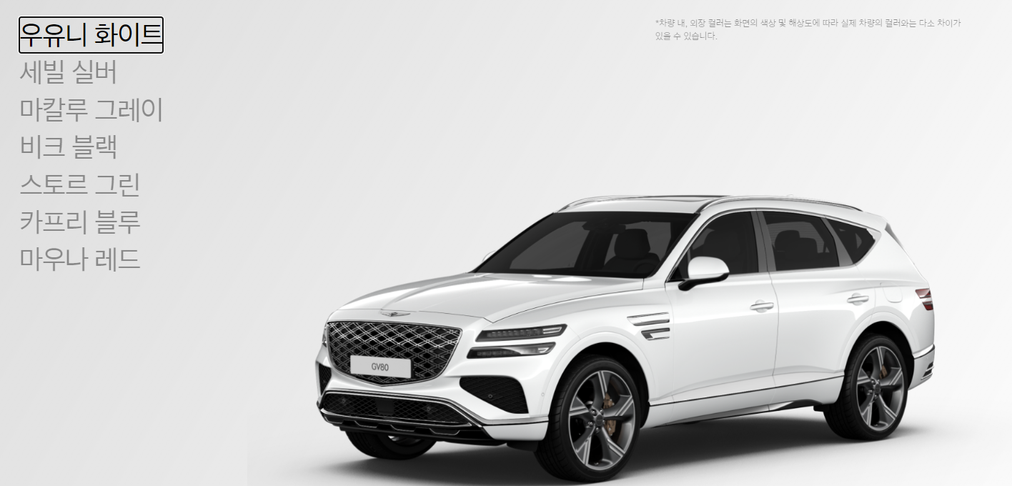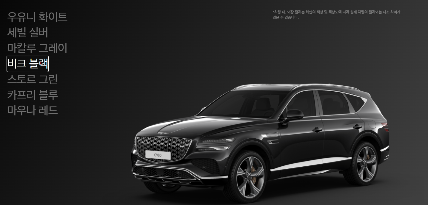 2024 GV80의 색상은 총 7가지로 우유니 화이트, 세빌 실버, 마칼루 그레이, 버크 블랙, 스토르 그린, 카프리 블루, 마우나 레드가 있습니다. 이번 2024 모델의 메인 컨셉 색상은 스토르 그린입니다.