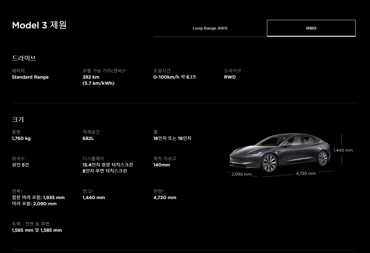 2024 테슬라 모델3는 싱글 모터 RWD 모델과 듀얼 모터 롱레인지, 퍼포먼스 모델로 나뉘는데요. 공식 출시 가격은 각각 5,199만원, 5,999만원, 6,799만원입니다. 현대차 아이오닉5와 비슷한 중형 세단 차종이지만, 가격은 조금 더 합리적인 편이죠.