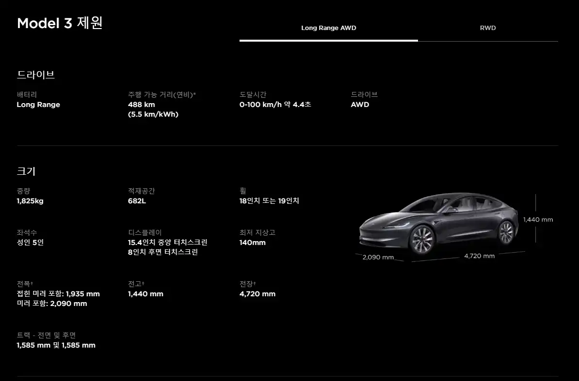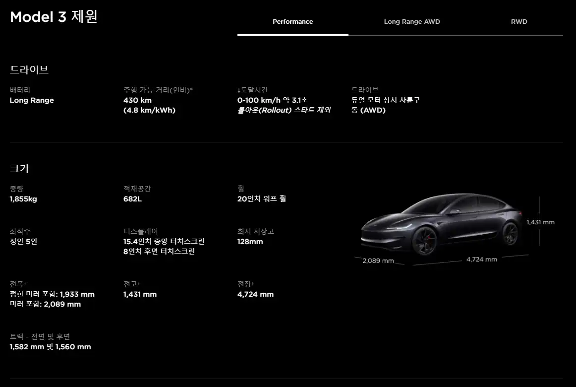 모델별로 성능과 제원이 확연히 차이납니다. 싱글 모터는 382km의 1회 충전 주행거리와 6.1초의 0-100km/h 가속 성능을 가졌고요. 듀얼 모터 롱레인지는 488km 주행거리와 4.4초의 가속 성능, 퍼포먼스 모델은 430km 주행거리와 3.1초의 가믹한 가속 성능을 자랑합니다.
