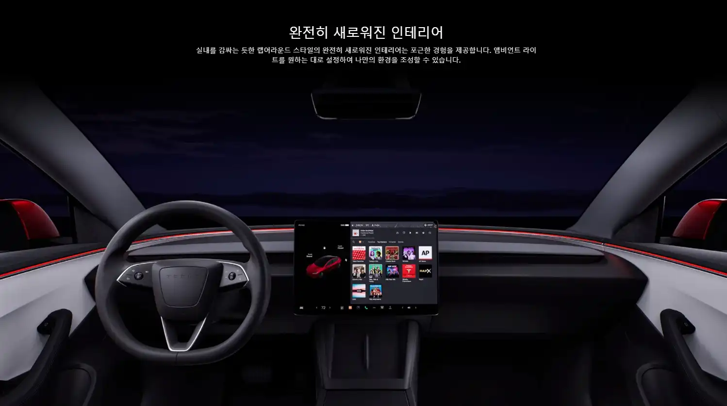 테슬라 특유의 군더더기 없는 인테리어가 매력적이죠. 도어에서 대시보드까지 한 줄기로 이어지는 어라운드 형태에 앰비언트 라이트까지 더해져 있습니다.