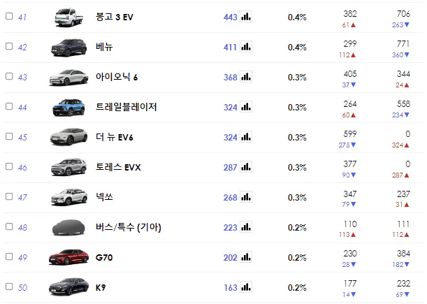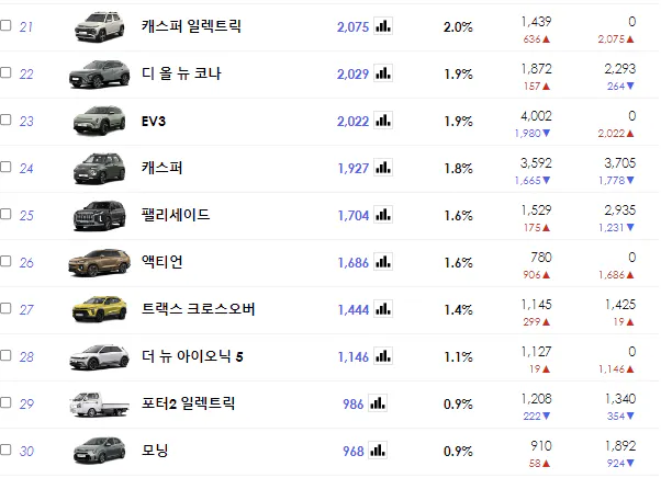전체 판매량 중 전기차가 차지하는 비중이 상당히 높아졌음을 알 수 있습니다. 특히 캐스퍼 일렉트릭, EV3, 더 뉴 아이오닉5 등이 상위권에 진입한 것이 눈에 띕니다.